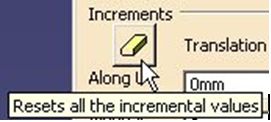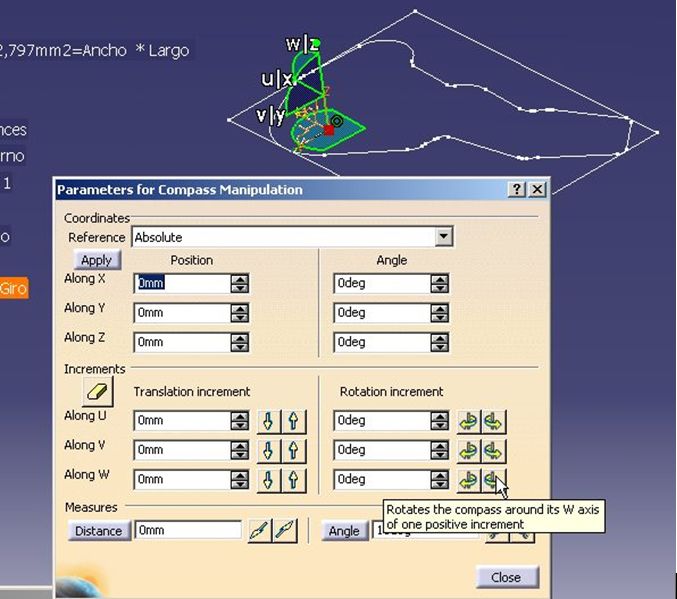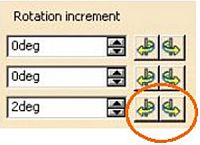 11.- Ya solo queda, "con la habilidad que nos caracteriza" poner un valor pequeño (por ejemplo 2 grados = 2deg) en el campo de "Rotation increment" correspondiente a W (es el correspondiente al eje Z) e ir dando a uno de los botones de las siguiente imagen y comprobando los resultados del parámetro "Area.1"