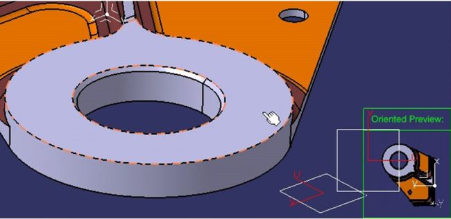 y cambiamos a la ventana de CATPart. Seleccionamos la cara plana paralela a la base y antes de seleccionar aparece una ventana "Orient Preview" que nos dice que orientación "previa" tendrá la vista.