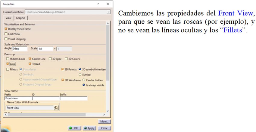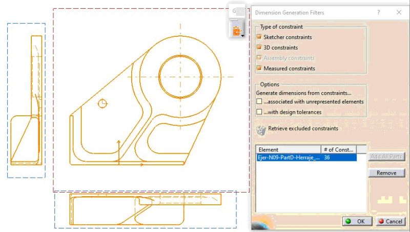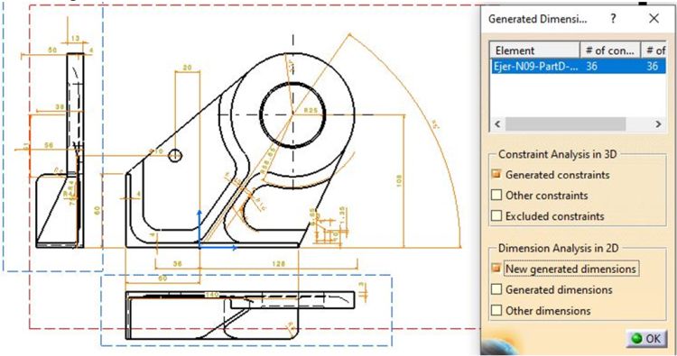 Este Comando tiene el inconveniente que crea cotas que no son importantes, como las alturas de, por ejemplo, los Pocket que eliminan material, cuando sólo importa las del contorno de dicho Pocket. También tiene el inconveniente de colocar las cotas, por ejemplo, de un taladro, en la vista "que a CATIA le parece"… y puede no ser la mas clara. Para eso está el comando "Generate Dimensions Step by Step".