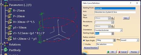 | 1.- | Creamos los parámetros, de la “Helix.1”: “R”=25mm; “P” = 20mm; “H” = P *1.5 =30mm. Y los de la “Helix.2”: “p1” = 10mm; “h2” = 2 * p1= 20mm;“r1”= al que no le calcularemos el valor. |