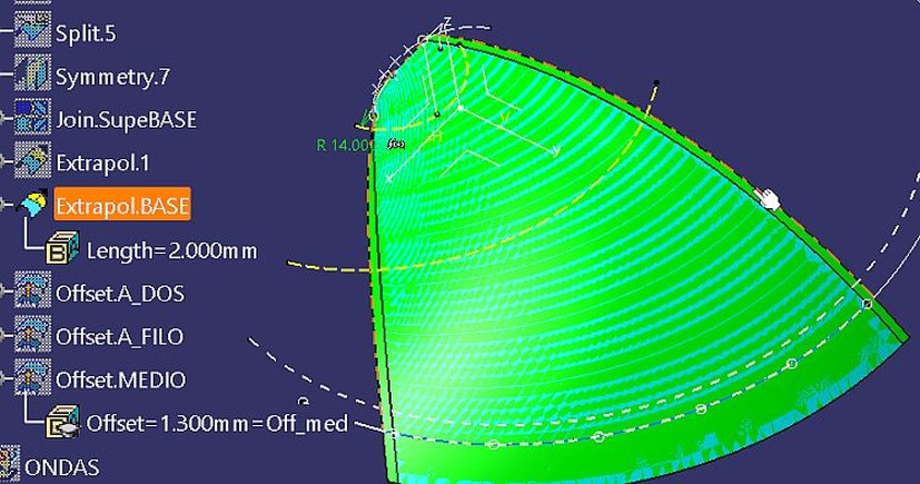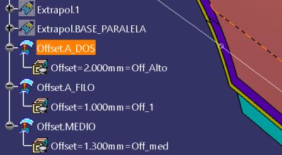 Hacemos superficies Offset a: "Offset.aDos"= 2mm por encima del "Extrapol.BASE"; "Offset.aUno"= 1mm por encima y "Offset.MEDIO"= 1.3mm por encima.