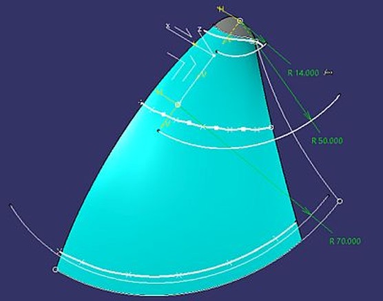1.- Proyectamos, en dirección Z, el radio de 70mm sobre la superficie "Offset.aDos" e identificamos como "Project.DELAN".