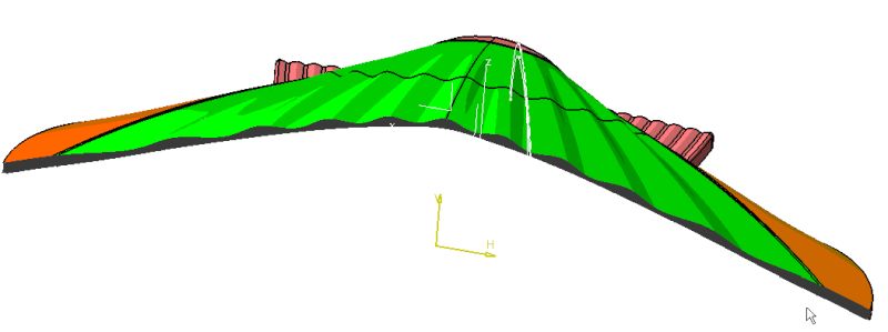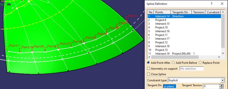 3.- Y obtenemos la "Spline.FILO". La única condición que le damos es: Que pase por el primero punto, con condición de continuidad de tangencia de la "Project.DELAN"; con los de puntos centrales (uno arriba y otro abajo) y en el punto final, otra vez condición de tangencia del plano YZ" (mirar la direcc. del vector).