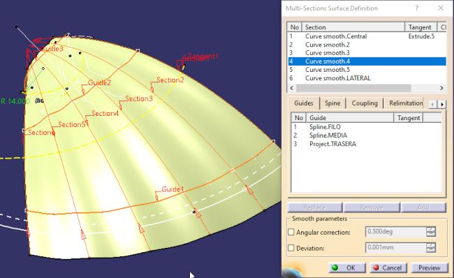 Una "Multi Section Surface" cuyas secciones son las 6 curvas "Smooth" y cuyas "Guías" son las Splines: