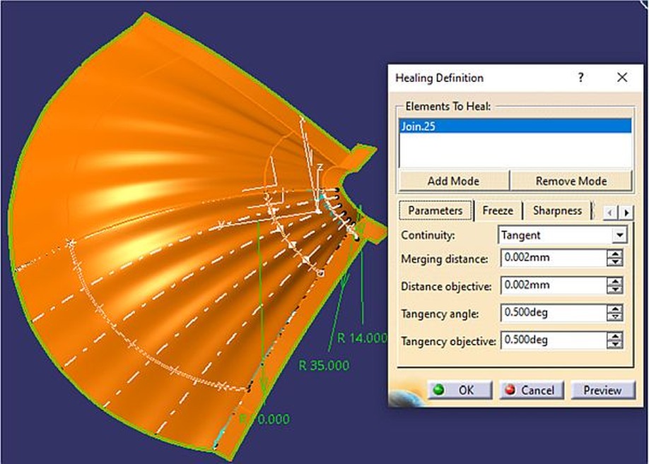 El espesor de la concha se hace en Part Design, mediante una "ThickSurface" de 2.1mm por arriba de la superficie base.