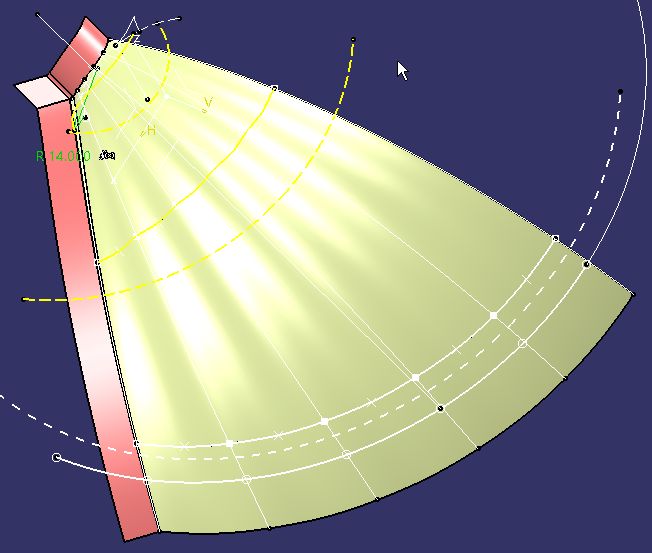 Proyectamos el Radio de 14mm, en dirección Z, sobre la superficie "Offset.aDos". Esa es la última curva Guía identificada como "Project.TRASERA". Esta define la "salida" de las Ondas.