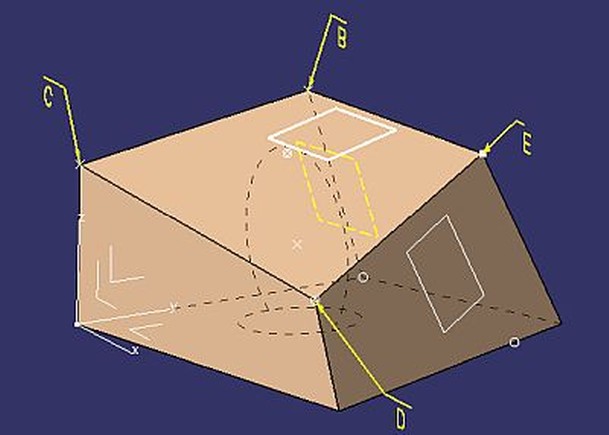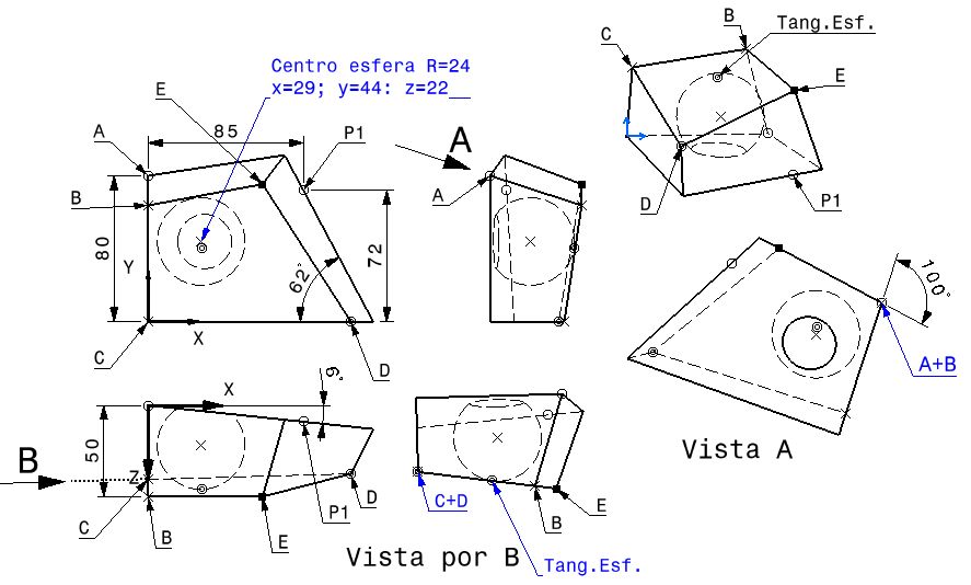 Queremos diseñar un sólido, a partir de dibujar sus aristas y los planos necesarios. Está formado por una serie de rectas y un plano (B-C-E-D) que "gira" sobre la recta BE y es tangente a una esfera, de radio 24mm y cuyo centro tiene de coordenadas: x=29mm; y=44mm; z=22mm.