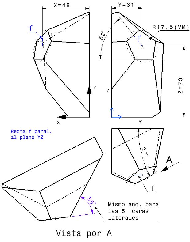 Se quiere obtener una pieza, diseñando solo sus aristas, mediante el uso de 1 Punto, Sketch, Líneas, Split, 6 Planos.. y algo mas. Usar Intersection (las menos posibles) para definir las líneas de las aristas de las caras laterales de la pieza.