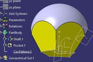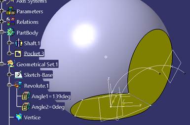 | 8.- | En el plano YZ, creamos un Sketch, posicionado, con origen en el “Project.Centro” y en él un semicírculo que pase por el punto “Vertice”. Con ese Sketch, colocándonos en el PartBody, obtenemos un Shaft. |