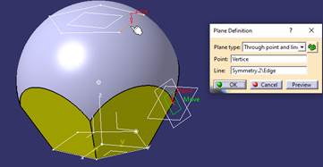 | 5.- | Obtenemos la intersección, de ese Revolute con el plano YZ. Lo identificamos como “Vertice”. Y obtenemos un Plane, “Point and Line” que pase por la intersección y esa línea del Sketch. Identificado como “Plane.CARA” |
