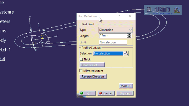 | 7.- | Insertamos un Body y, con el mismo Sketch anterior, hacemos un Pad con la caja interior de altura 17mm, pero desplegando el botón “More..”. El espesor del fondo se especifica en el “Second Limit” = -2mm. | ||