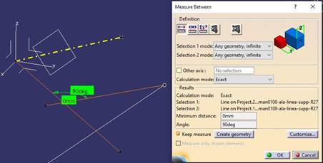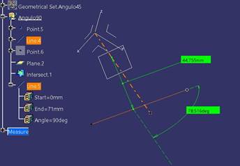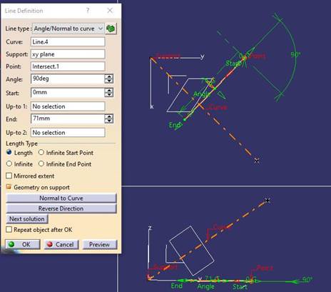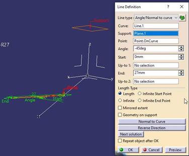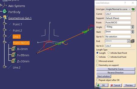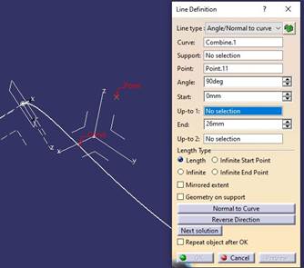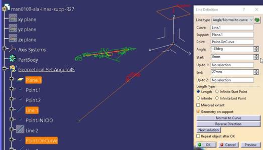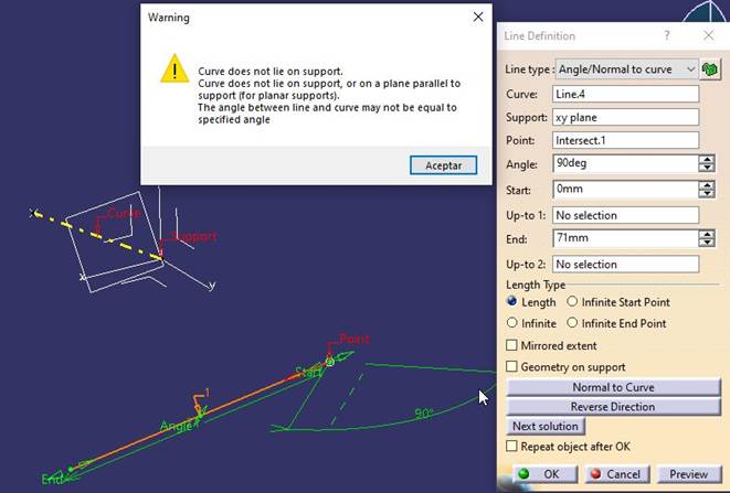 Las opciones de Line, opción “Angle/Normal to Curve”, pero respecto a una curva, son más restrictivas, dado que, en ese caso, lo normal es que la curva sea “plana” porque si no, el ángulo es muy discutible, cosa que CATIA V5 te advierte.