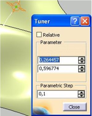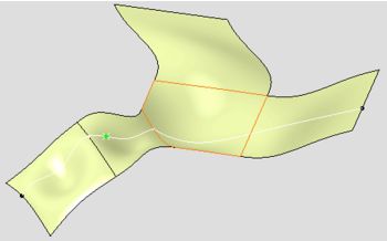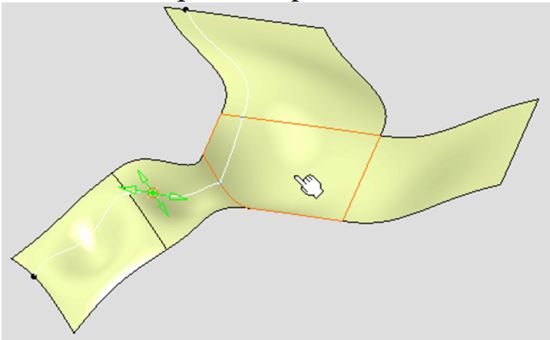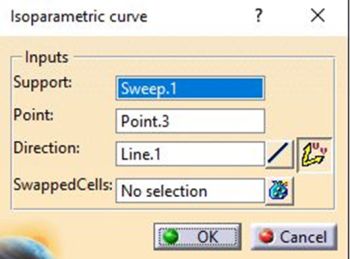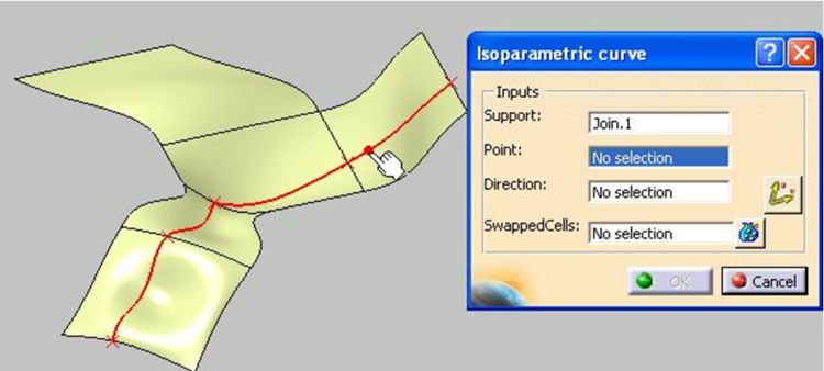 La curva isoparamétrica es pre-creada y un manipulador es mostrado. En caso de multi superficies, la superficie seleccionada es la celda de referencia.